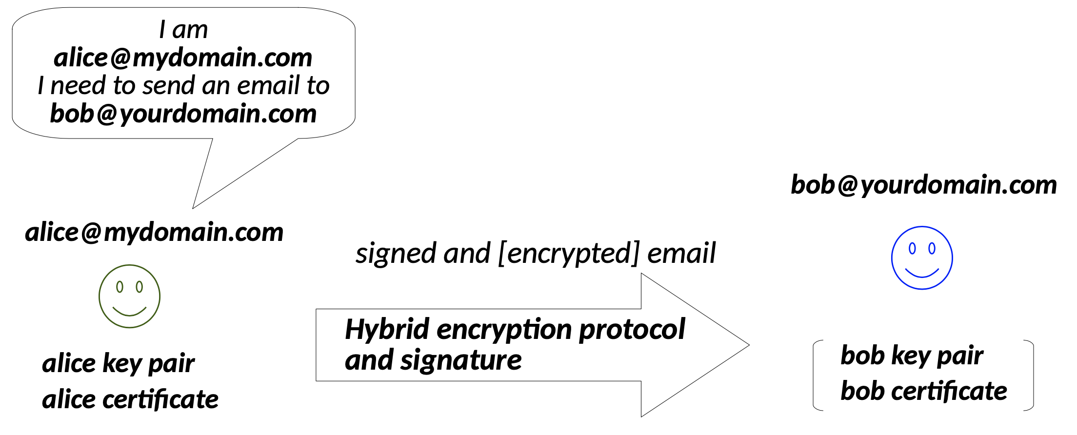 È anche utilizzabile dai protocolli email S/MIME. L’identità che si va ad autenticare è [email protected]. L’obiettivo non è ottenere uno scambio di chiavi sicure, ma piuttosto di riuscire ad utilizzare correttamente uno schema di cifratura e firma.