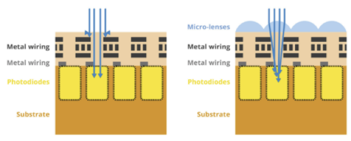 Nel sensore, specialmente in CMOS, l’area attiva di ogni pixel è circondata da circuiti e connessioni metalliche per il readout dell’immagine. Se la luce non è perpendicolare rischia di non essere letta. PEr questo si aggiunge uno strato di micro lenti, che aiutano la luce ad entrare nel fotodiodo.